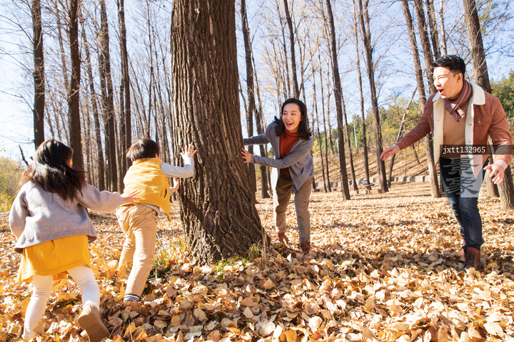 图片标题: 欢乐家庭在户外玩捉迷藏游戏