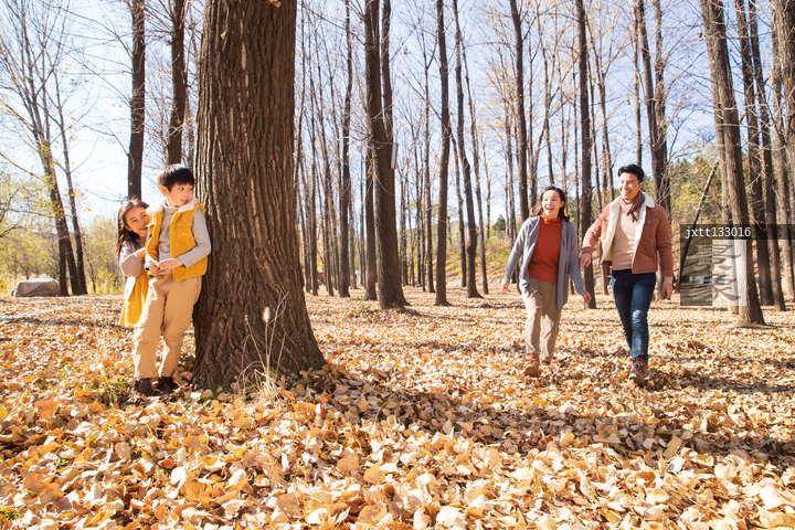 图片标题: 欢乐家庭在户外玩捉迷藏游戏