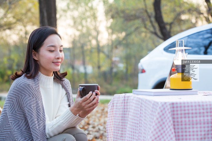 图片标题:     青年女人坐在户外喝水