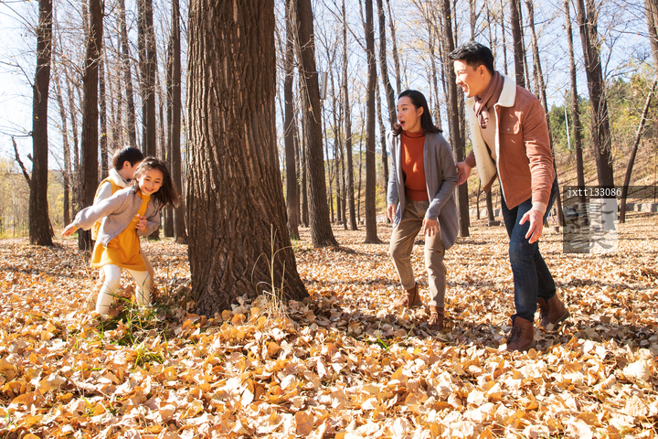 图片标题: 欢乐家庭在户外玩捉迷藏游戏