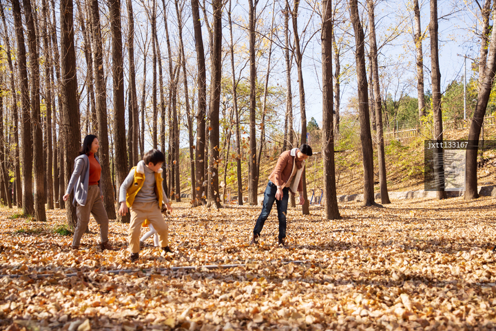 图片标题: 快乐家庭在树林里玩耍