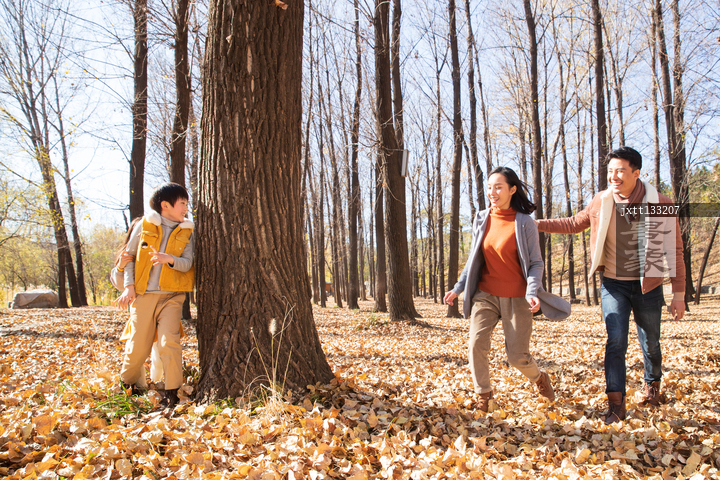图片标题: 欢乐家庭在户外玩捉迷藏游戏