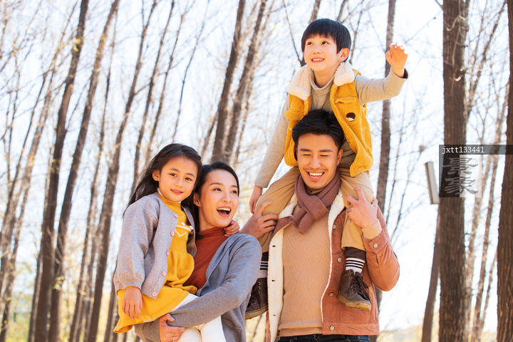 图片标题: 幸福家庭在树林里玩耍