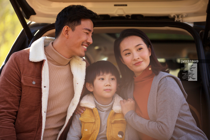 图片标题: 一家三口坐在汽车后备箱里