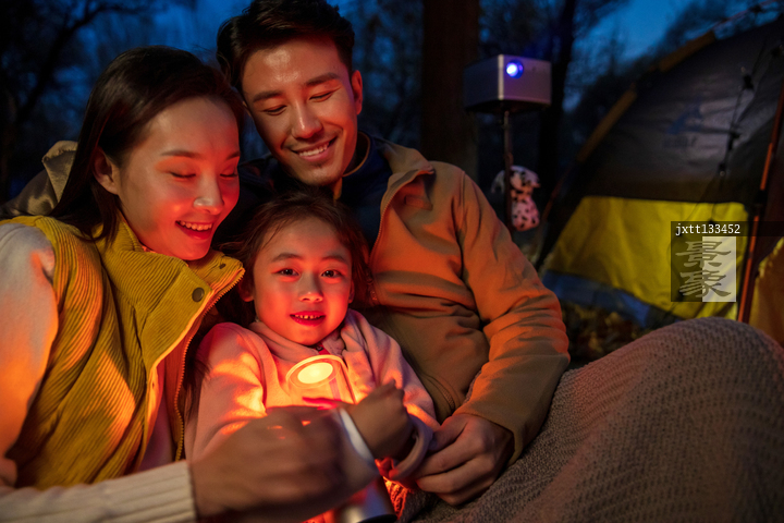 图片标题: 一家三口夜晚在野外露营