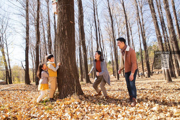 图片标题: 欢乐家庭在户外玩捉迷藏游戏