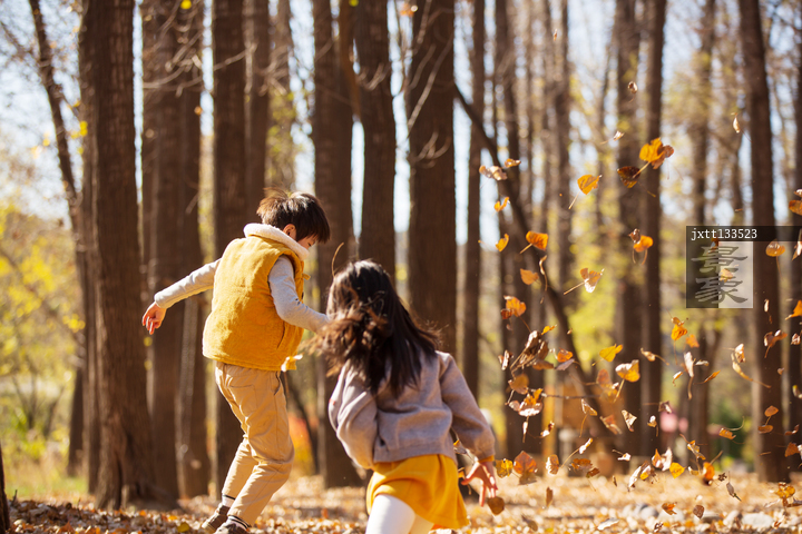 图片标题: 可爱的男孩女孩在树林里玩树叶