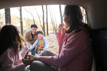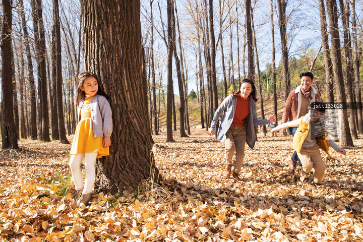 图片标题: 欢乐家庭在户外玩捉迷藏游戏