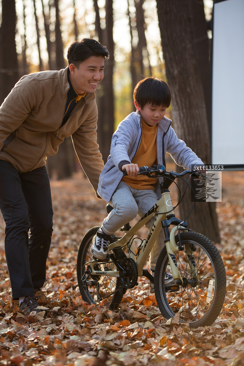 图片标题: 青年父亲教孩子骑自行车