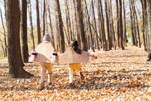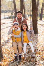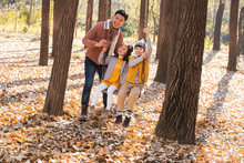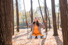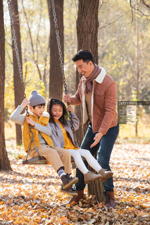 图片标题: 青年父亲推着孩子荡秋千
