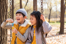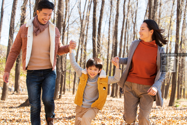 图片标题: 快乐家庭在树林里玩耍