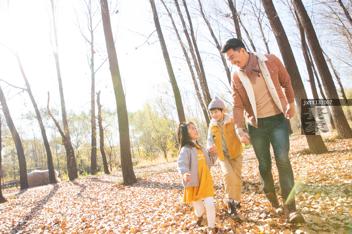 图片标题: 青年父亲带着孩子们在树林里玩耍