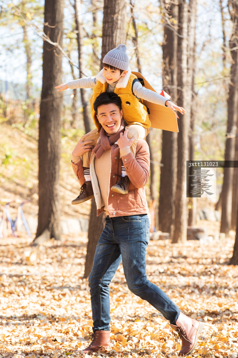 图片标题: 年轻父亲带着孩子玩飞机游戏