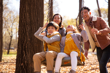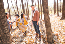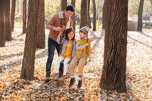 图片标题: 快乐家庭走在树林里