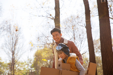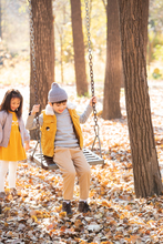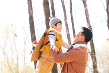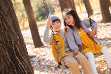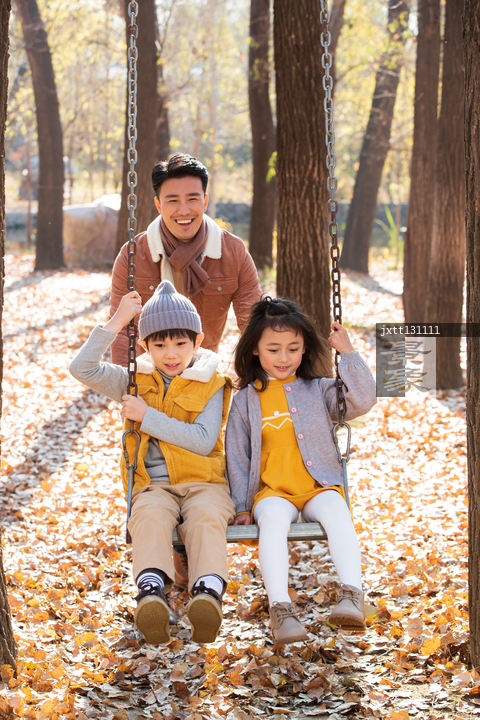 图片标题: 青年父亲推着孩子荡秋千