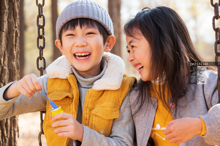 图片标题: 快乐儿童坐在秋千上吹泡泡