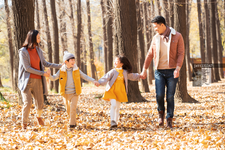 图片标题: 快乐家庭走在树林里
