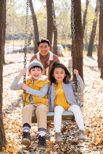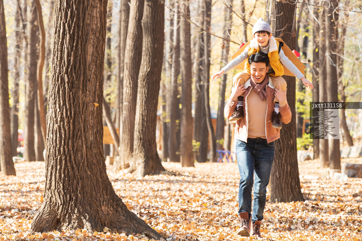 图片标题: 年轻父亲背着孩子玩飞机游戏