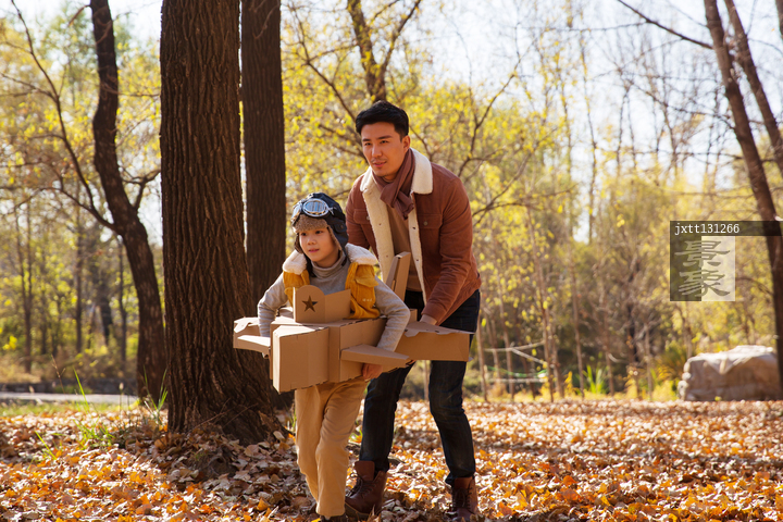 图片标题: 年轻父亲带着孩子玩飞机游戏
