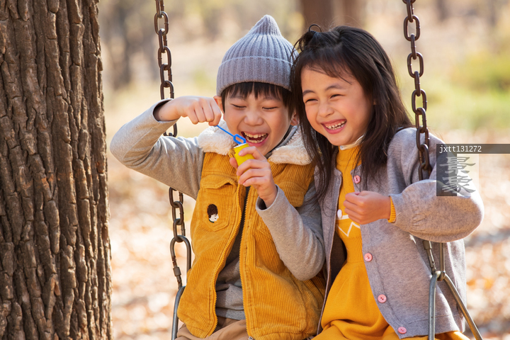 图片标题: 快乐儿童坐在秋千上吹泡泡