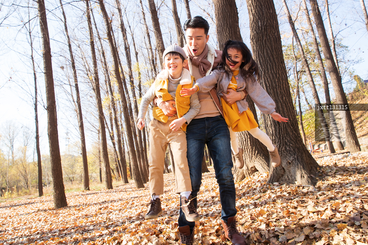 图片标题: 青年父亲带着孩子们在树林里玩耍