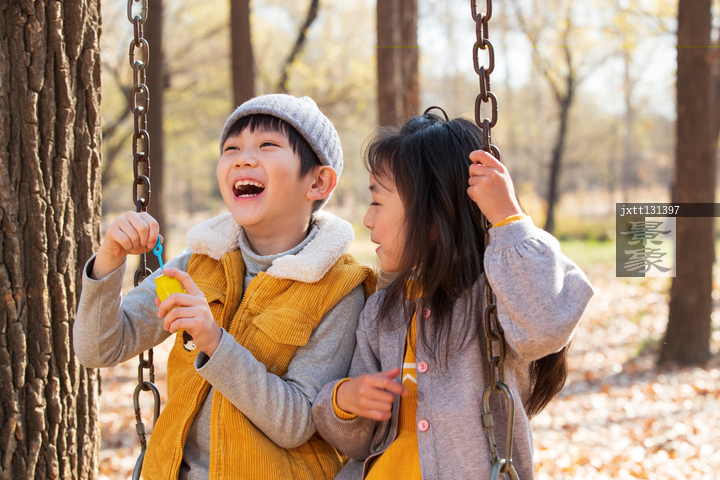 图片标题: 快乐儿童坐在秋千上吹泡泡