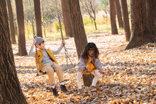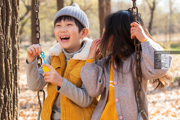 图片标题: 快乐儿童坐在秋千上吹泡泡