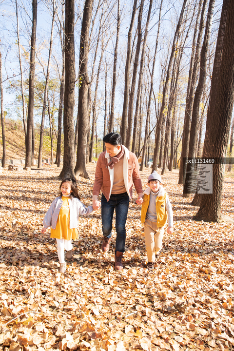 图片标题:     青年父亲带着孩子们在树林里玩耍