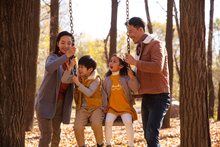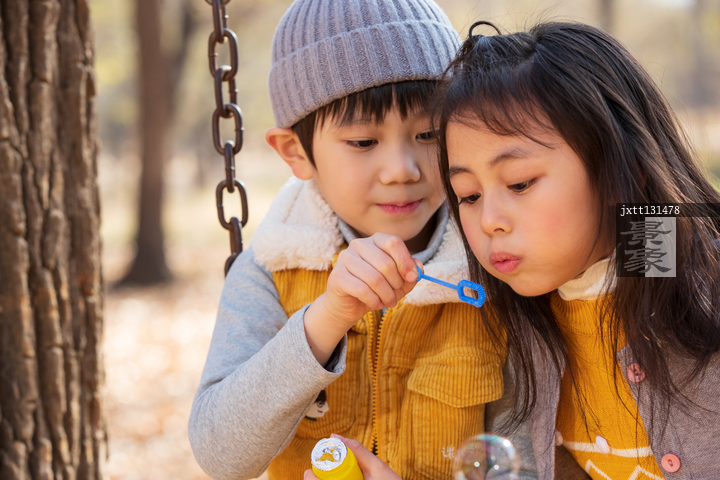 图片标题:     快乐儿童坐在秋千上吹泡泡