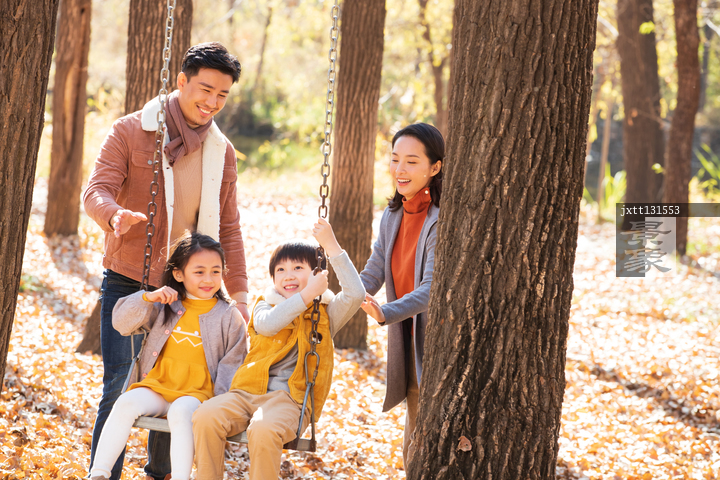 图片标题: 快乐家庭在户外荡秋千