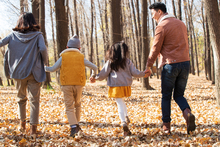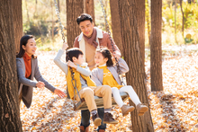 图片标题: 青年父亲带着孩子们在树林里玩耍