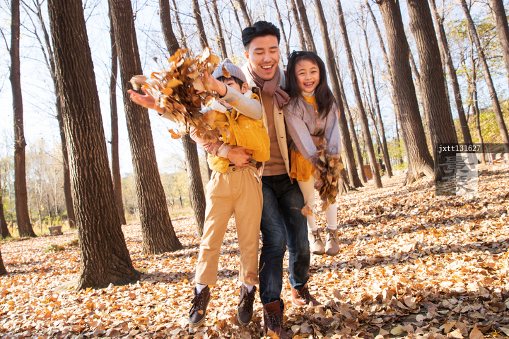 图片标题: 青年父亲带着孩子们在树林里玩耍