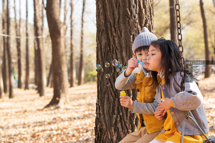 图片标题: 快乐儿童坐在秋千上吹泡泡
