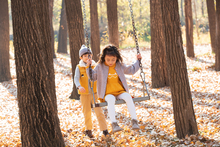图片标题: 青年父亲带着孩子们在树林里玩耍