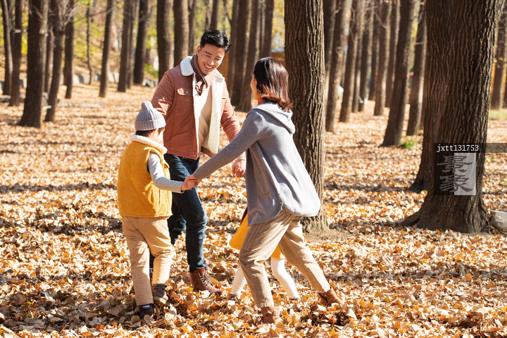 图片标题: 快乐家庭在树林里玩耍