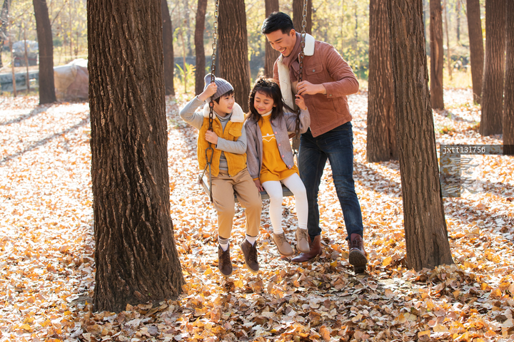 图片标题: 青年父亲推着孩子荡秋千