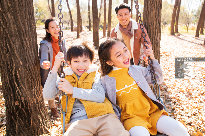 图片标题: 快乐家庭在户外荡秋千