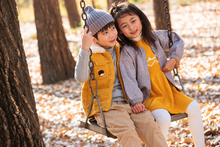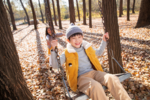 图片标题: 快乐儿童坐在秋千上吹泡泡
