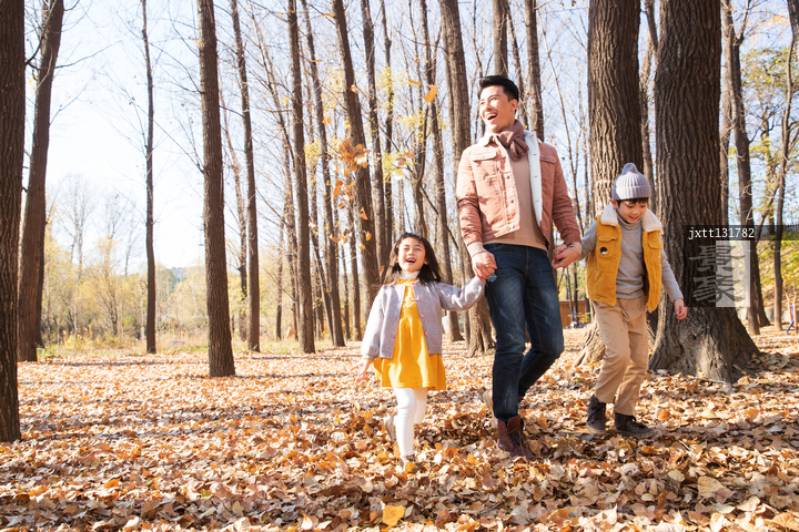 图片标题: 青年父亲带着孩子们在树林里玩耍