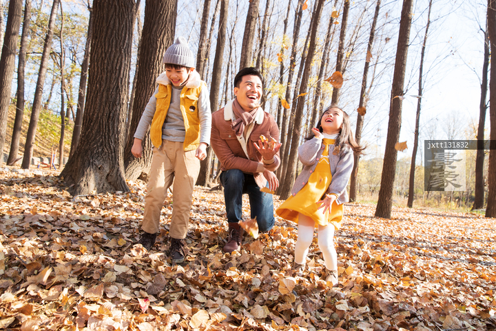 图片标题: 青年父亲带着孩子们在树林里玩耍