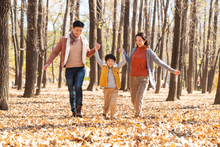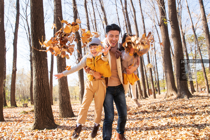 图片标题: 青年父亲带着孩子们在树林里玩耍