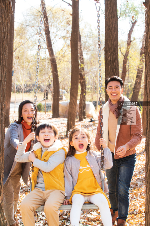 图片标题: 快乐家庭在户外荡秋千