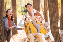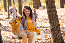 图片标题: 快乐儿童坐在秋千上吹泡泡