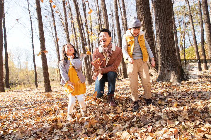 图片标题: 青年父亲带着孩子们在树林里玩耍