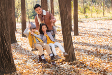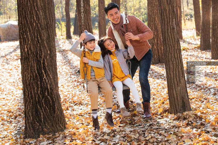 图片标题: 青年父亲推着孩子荡秋千