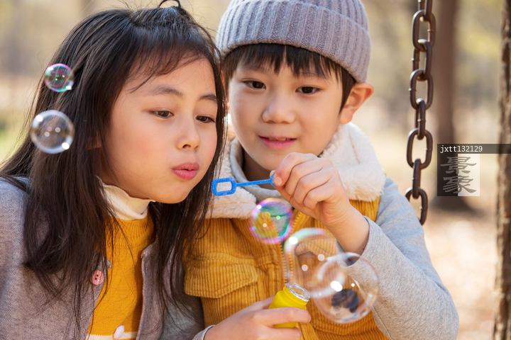 图片标题: 快乐儿童坐在秋千上吹泡泡