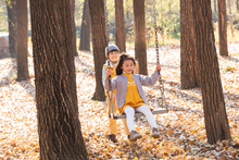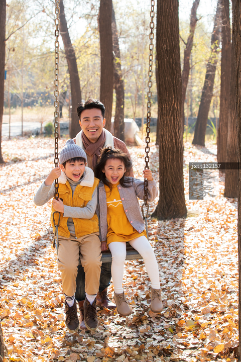 图片标题: 青年父亲推着孩子荡秋千