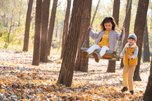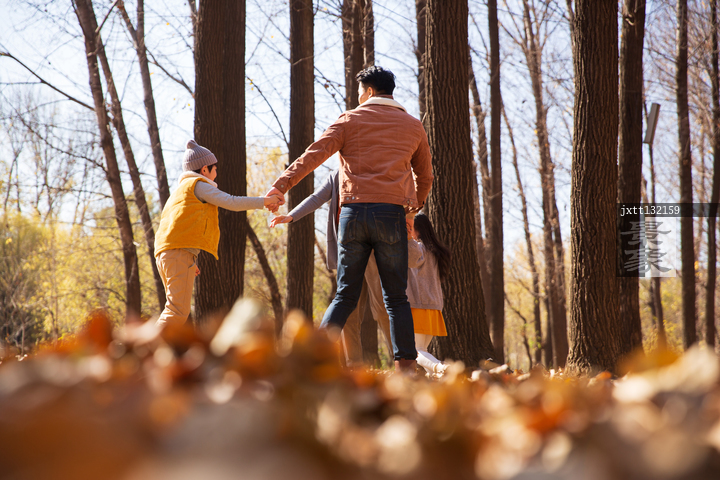 图片标题: 快乐家庭在树林里玩耍
