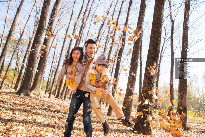 图片标题: 青年父亲带着孩子们在树林里玩耍