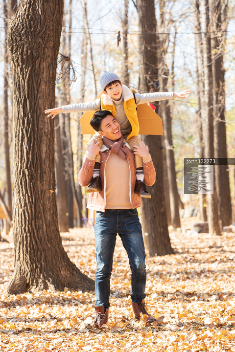 图片标题: 年轻父亲带着孩子玩飞机游戏
